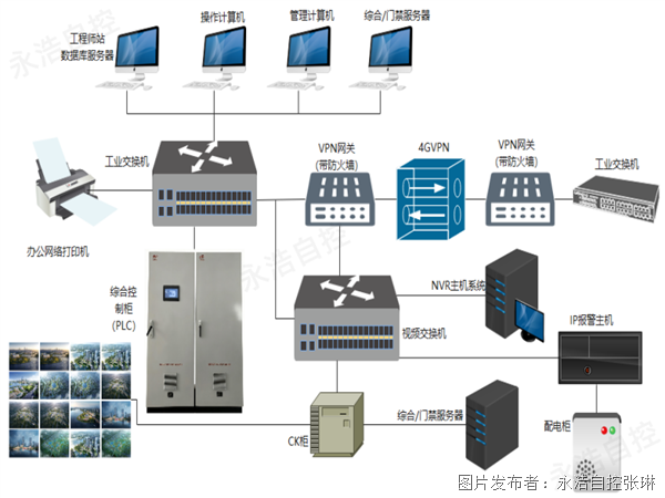 视频安防设备(泵房、配电间等区域的IP 网络摄像机△-、NVR 存储设备)▪、门禁及电子围栏等安防联动设备★●-,可实现生产场景与安防场景的一体化管控;还包含工业级网络交换机、VPN 路由器等通信传输设备,以及 UPS 不间断电源等供电保障设备,确保设备层与控制层的通信畅通及设备断电续航。