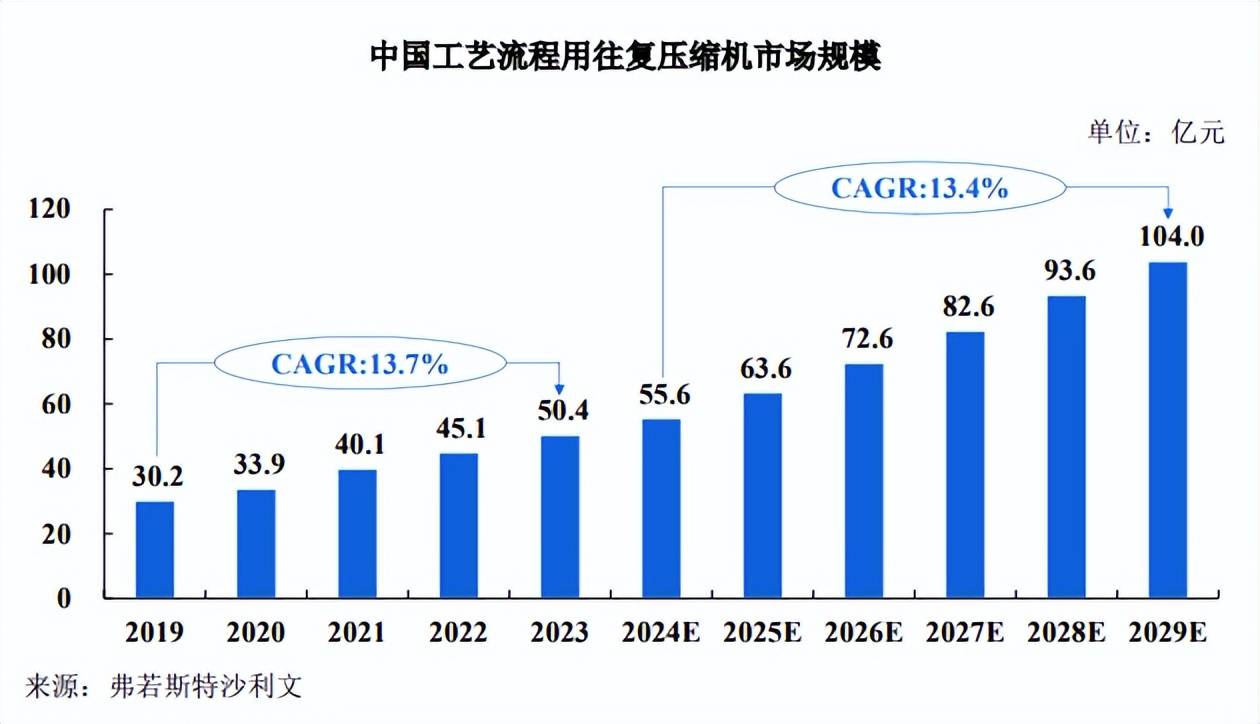 随着国内工业化进程的加速,工艺流程用往复压缩机市场需求呈现出持续增长的趋势,根据弗若斯特沙利文《全球及中国压缩机行业独立市场研究报告》,中国工艺流程用往复压缩机市场规模从 2019 年的 30.2 亿元增长至 2023 年的 50.4 亿元◆,期间年复合增长率达到 13.7%。随着石油化工△、煤化工▲…、天然气化工以及新能源等领域的快速发展,加之国内压缩机制造企业在技术创新方面的持续投入•,预计中国工艺流程用往复压缩机市场规模将从 2024 年的 55.6 亿元增至 2029 年的 104•▽.0 亿元,期间年复合增长率预计将达 13△.4%▲。