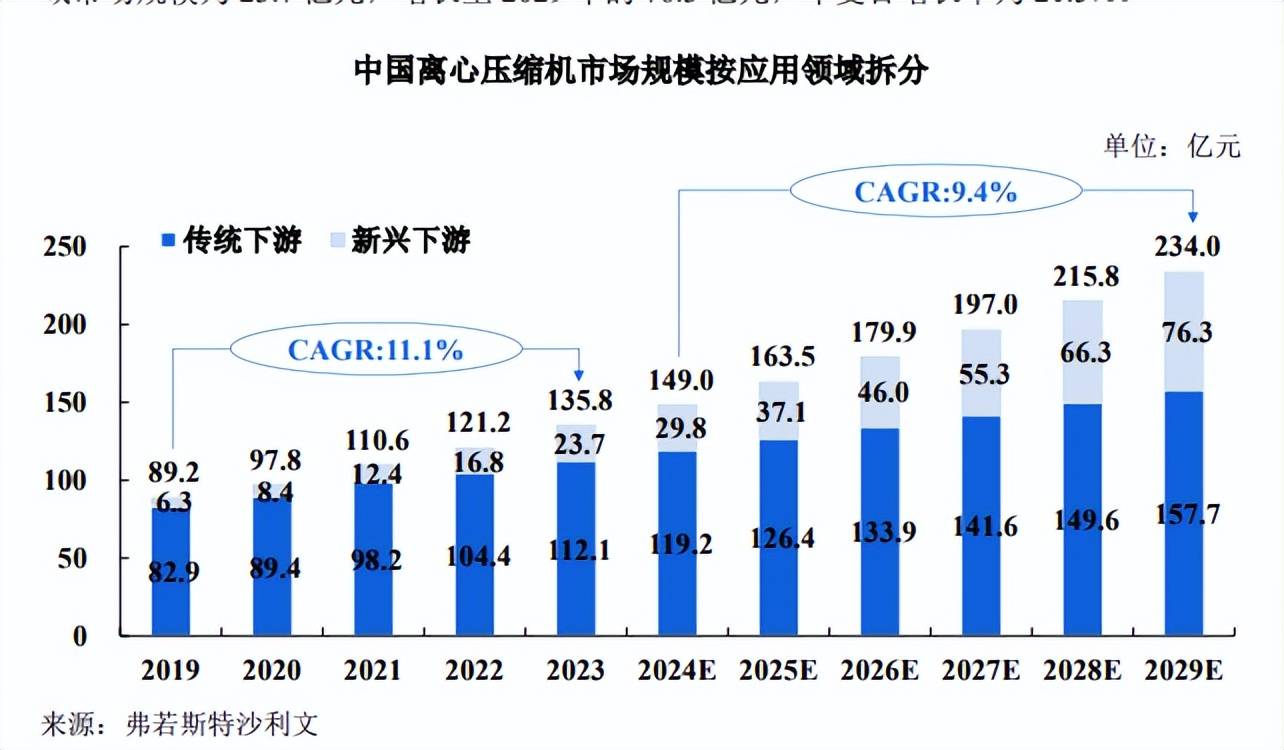 根据弗若斯特沙利文《全球及中国压缩机行业独立市场研究报告》□,2023 年中国离心压缩机传统下游应用领域市场规模为 112.1 亿元,预计未来六年以 5◁▲▼.8%的年复合增长率持续增长,到 2029 年达到 157.7 亿元;2023 年中国离心压缩机新兴下游应用领域市场规模为 23.7 亿元,增长至 2029年的 76.3亿元,年复合增长率为 21.5%。