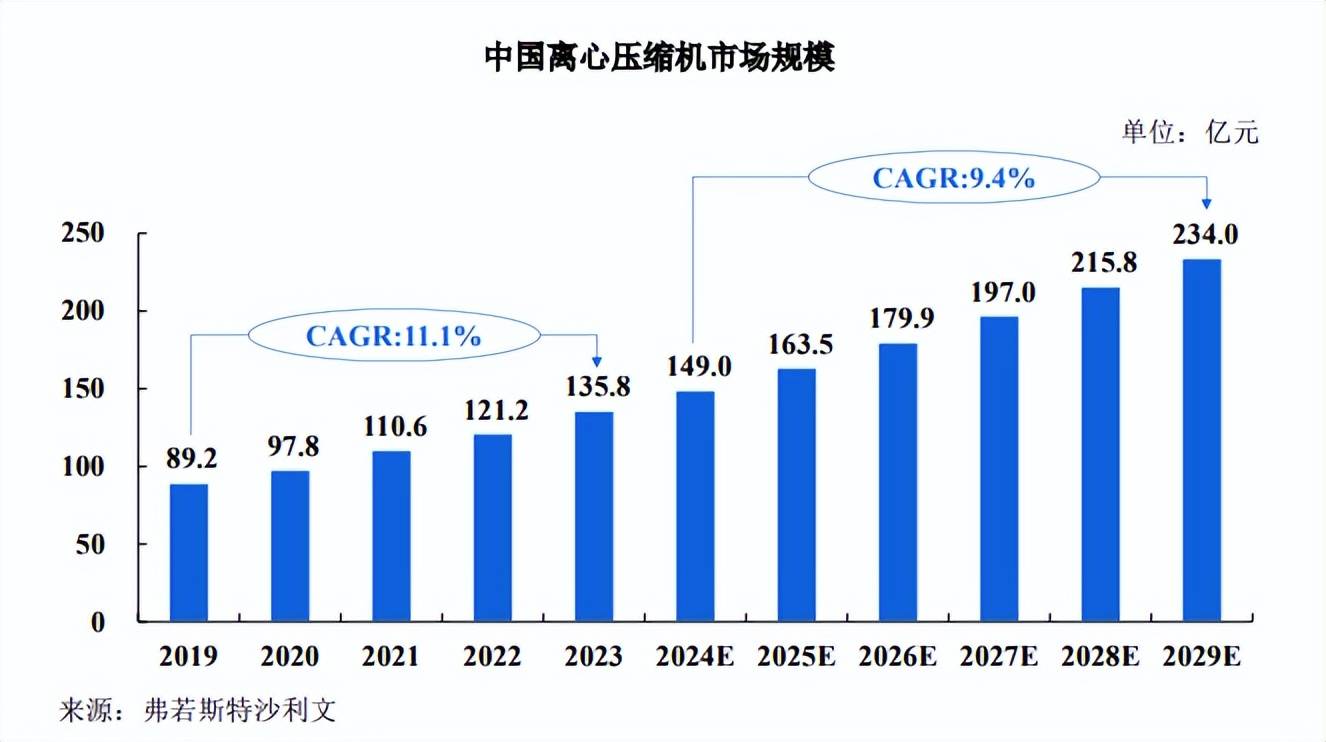 随着全球及国内工业化与能源转型的深入发展,离心压缩机市场需求进一步得到激发。根据弗若斯特沙利文《全球及中国压缩机行业独立市场研究报告》◁★,中国离心压缩机市场规模从 2019 年的 89△▲■.2 亿元增长至 2023 年的 135.8 亿元△☆▽,年复合增长率为11.1%。新兴领域的快速发展为离心压缩机提供了新的应用场景和市场增长点,预计中国离心压缩机市场规模将从 2024 年的 149□☆….0 亿元增至 2029 年的 234.0 亿元,期间的年复合增长率预计将达 9.4%。
