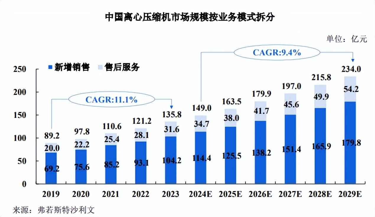 根据弗若斯特沙利文《全球及中国压缩机行业独立市场研究报告》,2023 年中国离心压缩机新增销售市场规模为 104■•▽.2 亿元○•,售后服务市场规模为 34.7 亿元。随着工业规模的不断扩大和技术的持续进步◆,企业对离心压缩机的长期可靠性和运行效率的要求越来越高,未来中国离心压缩机市场的售后服务需求将持续增长,预计到 2029 年▷,离心压缩机的售后服务市场规模将达到 54.2亿元。