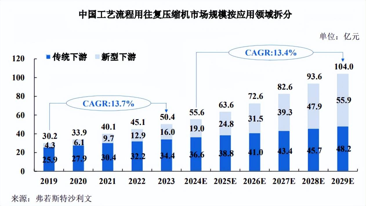 往复压缩机作为工业流程中的关键设备,具有高效★◇、可靠、适应性强等优势,广泛应用于各种气体的压缩和输送环节●,在各类传统及新兴下游应用领域都有望迎来积极的发展前景▪。在石油化工、煤化工、天然气化工等传统领域,往复压缩机的需求主要受工业生产规模和技术升级的驱动■☆。同时…▷▷,随着全球能源需求的持续增长,对更高效、可靠的设备来确保连续生产和降低运营成本的需求亦持续增强,环境法规的日趋严格亦推动了企业对设备性能、能效和排放控制的要求。根据弗若斯特沙利文《全球及中国压缩机行业独立市场研究报告》▪▲△,2023 年,中国工艺流程用往复压缩机传统下游应用领域市场规模为 34.4 亿元,预计到 2029 年将增长至 48▲■▷.2 亿元,年复合增长率为 5=.7%。