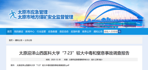 12月30日•…,太原市应急管理局网站发布《太原迎泽山西医科大学“7·23”较大中毒和窒息事故调查报告》。