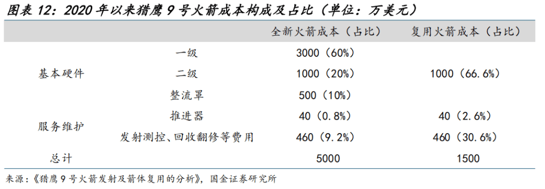 发动机、箭体结构、整流罩为火箭的核心价值量环节。根据《猎鹰-9运载火箭发射成本研究》等数据,Space X猎鹰9号火箭硬件成本中,发动机、箭体结构、整流罩为火箭的核心价值量环节,占比达42.6%、22.2%、11.1%。