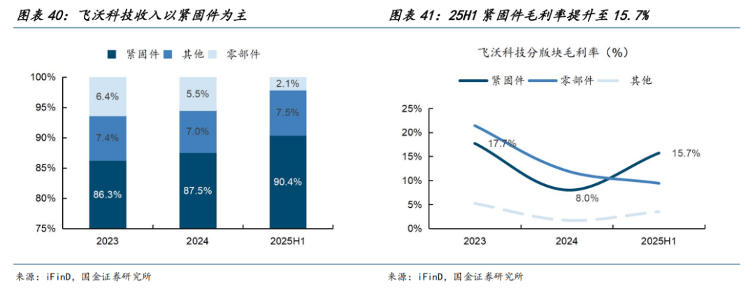 飞沃科技收入以紧固件为主,受益风电行业景气度上行,25H1毛利率提升至15.7%。25H1飞沃科技收入中紧固件占比达90◆▼.4%,得益于风电下游客户需求旺盛带来的销售量增长,叠加产品销售价格提升及单位成本下降,毛利率提升至15.7%,相对24年提升7.7pct。