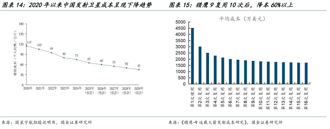 猎鹰9复用10次后相对单次发射成本降低60%以上,国内商业火箭的下一站或为实现可回收。1)我们前文提出中国抢占低轨卫星轨道资源至关重要★★,而发射成本降低是实现低轨卫星批量化发射的核心要素,随着火箭技术的提升和成熟,国内目前单颗卫星的发射成本从20年11.5万元/公斤降低至2024年7.5万元/公斤;2)国内商业航天的下一站为可回收:根据《猎鹰-9运载火箭发射成本研究》•▽,猎鹰9单次发射成本为4500万美元,复用10次后单次发射成本将降低至1700万美元▲-▷,而Space X的合同对外报价为单次发射6200万美元,可复用后▪▼,火箭发射的经济性大幅提升。反观国内若实现可回收后,成本降低有望与客户一定程度分享降本收益,打通商业航天逻辑闭环。