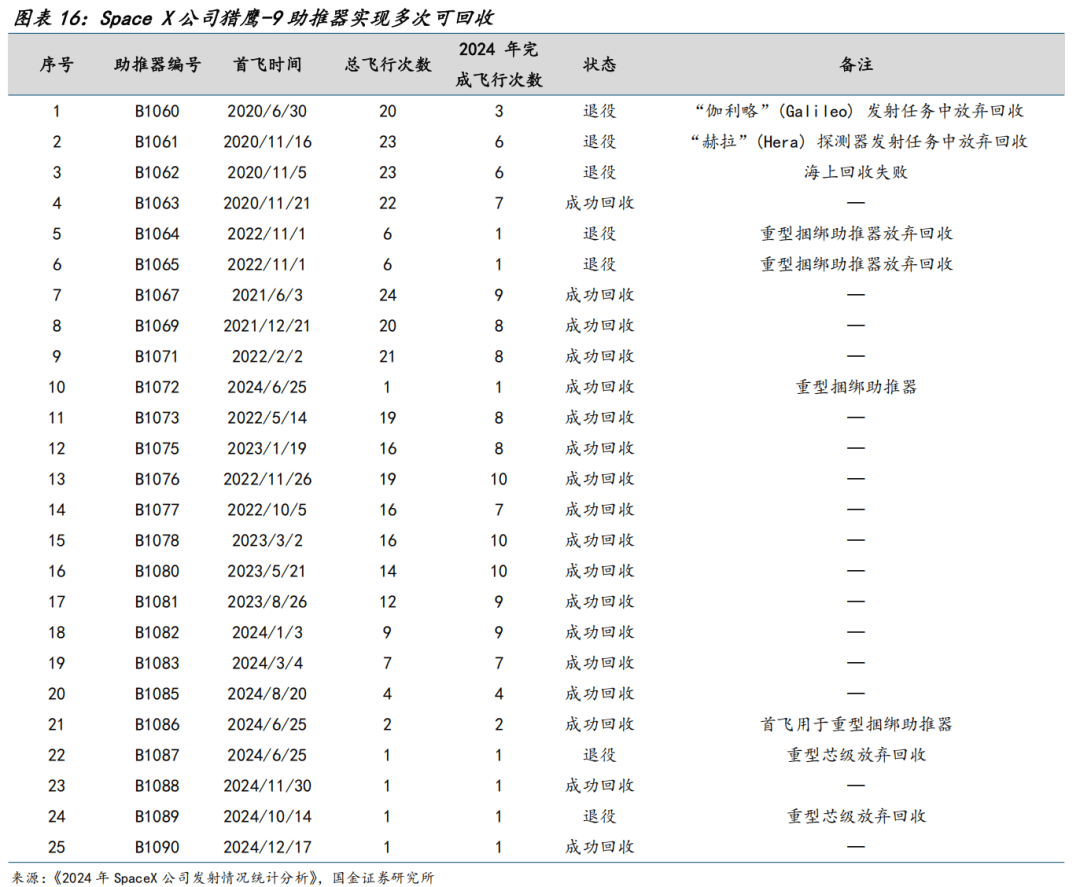 可回收火箭能够有效缩短发射间隔周期。传统火箭发射一次后,一子级、二子级火箭均坠毁或损坏…,需要重新生产一个全新的火箭▲,整个生产周期、测试周期较长。可回收火箭的一子级只需进行翻新▽,周期缩短☆-,能有效提升发射频率:2024年SpaceX共进行138次火箭发射,月发射次数最高达16次,同一发射场最短任务周转间隔为2天15小时53分钟=▪,同一枚一子级最短周转时间为13天12小时34分钟。