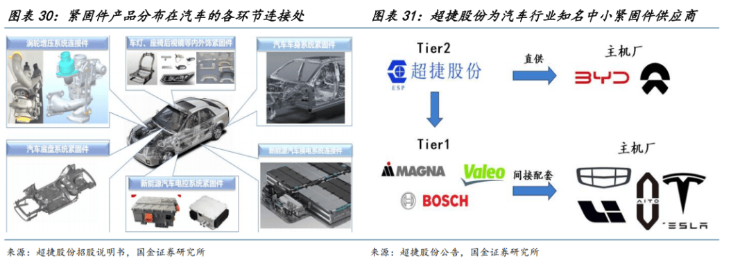 超捷股份是国内汽车紧固件知名供应商,配套头部主机厂。紧固件在汽车的各个系统中起着连接、固定和支撑的关键作用,是保证汽车结构稳定性和安全性的关键产品,应用在内外饰、车身系统、动力系统、电池包等多个环节▼■。公司是紧固件知名Tier1/2厂商,其中作为Tier 1直接配套比亚迪、蔚来;作为Tier 2间接配套问界、理想、特斯拉、吉利等厂商。