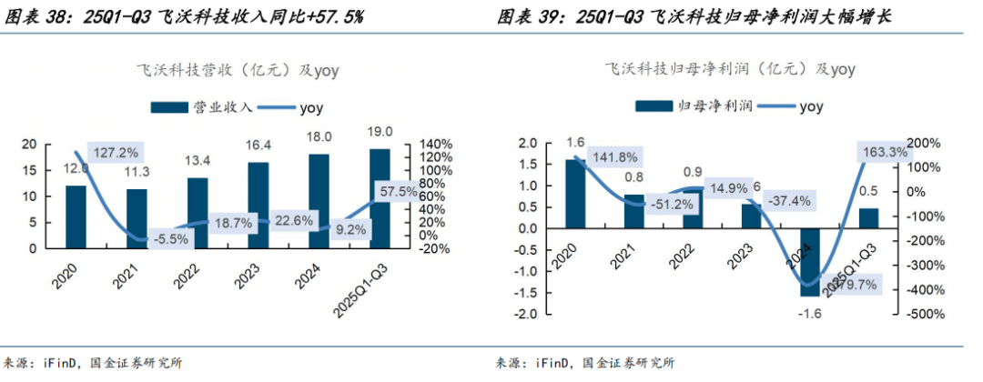 25Q1-Q3飞沃科技费用率下行▷☆,盈利能力显著提升。营收规模的增长,带来固定成本均摊降低□•,规模效应显现带动公司销售费用率◆、管理费用率下行,25Q1-Q3飞沃科技销售费用率、管理费用率为4.2%…■□、0.9%◁•△,相对24年降低1△★▼.1pct、0.7pct。费用率下行叠加产品销售价格提升=…☆,飞沃科技25Q1-Q3净利率提升至1.9%,相对24年提升10.7pct。