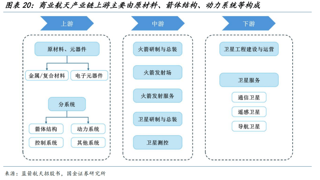 商业航天产业链涵盖从研发、制造、发射○、运营到应用服务等多个环节的产业体系,产业链上游主要为卫星与火箭的原材料、元器件与分系统,中游为火箭研制与总装、火箭发射场及发射服务、卫星研制与总装★◇▼、卫星测控,下游为卫星工程建设•◆▲、运营及卫星服务。