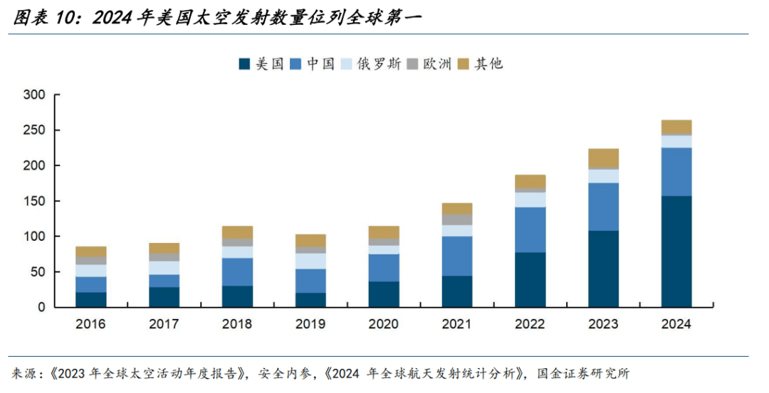 低轨卫星组网迫切需求倒逼发射计划推进。根据《2024 年全球航天发射统计分析》,2024年中国、美国太空发射分别为68次和158次▷,目前国内星网、G60组网需求迫在眉睫,有望倒逼国内发射加速。