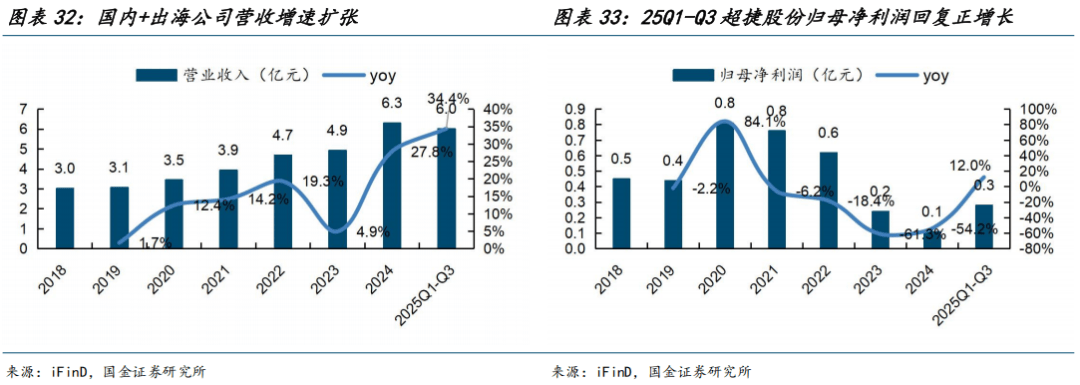 汽车紧固件主业回暖,利润开始正增长△▪。24年、25Q1-Q3超捷股份主业汽车紧固件国内、出海双增长,拉动营收规模持续提升,其中25Q1-Q3营收增速达34.4%,新工厂厂房折旧费用增加等短期影响利润释放,后续看好高毛利订单放量带动利润向上。