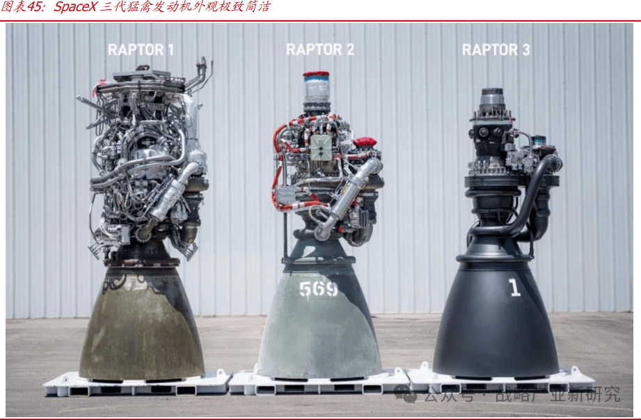 三代猛禽发动机【Raptor 3】:从外观设计上看,前两代错综凌乱的管线消失不见◆△,取而代之的是几根管径粗大▷、整齐布列的排线,发动机整体造型十分简洁。第三代猛禽通过 3D 打印工艺■=•,将前两代的多零部件整合为一,其设计上采用了整体的冷却通道壁,还将某些次级管路集成到主涡轮泵中,大幅简化了发动机的结构,使得发动机零部件的管端连接◆○◇、线路连接以及各类螺丝垫片大幅减少◁▲▼,同时取消了发动机的隔热罩,整个发动机重量骤降 100 多公斤达到 1525 公斤,而且还减少了潜在的故障点■☆,提高了发动机的可靠性□▪◁。先进金属 3D 打印工艺的使用使得 Raptor 3减重 7%●,推力相较于 Raptor 2 高出了 21%。