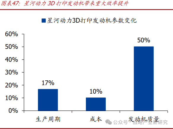 智神星二号CQ-90发动机上□▷,90%以上重量采用3D打印技术制造●▲。3D打印工艺发动机生产周期缩短至1个月内,为传统模式的1/6,制造成本降至原来的10%,同时发动机重量减轻50%,显著提升了运载效率和经济性。一台2500N火箭发动机核心零件的制造成本,从传统工艺的50万元降至3D打印技术的不到5万元△。星河动力在其苍穹50吨级液氧煤油发动机中,涡轮泵3D打印件重量占比约65%,发生器3D打印件重量占比约75%◁,主管路90%为3D打印件,推力室3D打印部分占比约30%,阀门壳体类零件约90%为3D打印制造■。铂力特2024年商业航天领域订单中-☆,星河动力占比超30%。2019年,飞而康科技与星河动力合作,利用华曙高科金属3D打印解决方案▪◁,在4个月内完成30多件火箭发动机零件的交付;