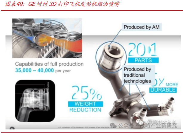 截至 2021 年◁▲…, 美国GE增材已经打印了超过 10 万个航空发动机燃油喷嘴,并实际应用于其最先进的“LEAP 发动机”中,空客 A320 NEO、波音 737 MAX和中国国产 C919 大型客机都采用了 Leap 引擎。传统的燃油喷嘴由 20 个单独的部件焊接而成▷=▪,采用 SLM 3D 打印技术◁=,整套喷嘴可以一次成形,无需后续焊接,零件数量降为 3 个。改进后的燃油喷嘴具有质量轻、强度大和耐腐蚀的特性,可在高达近千摄氏度的环境下正常工作,重量减少 25%-•,使用寿命提升至 5 倍,燃油效率也得到极大的提升;
