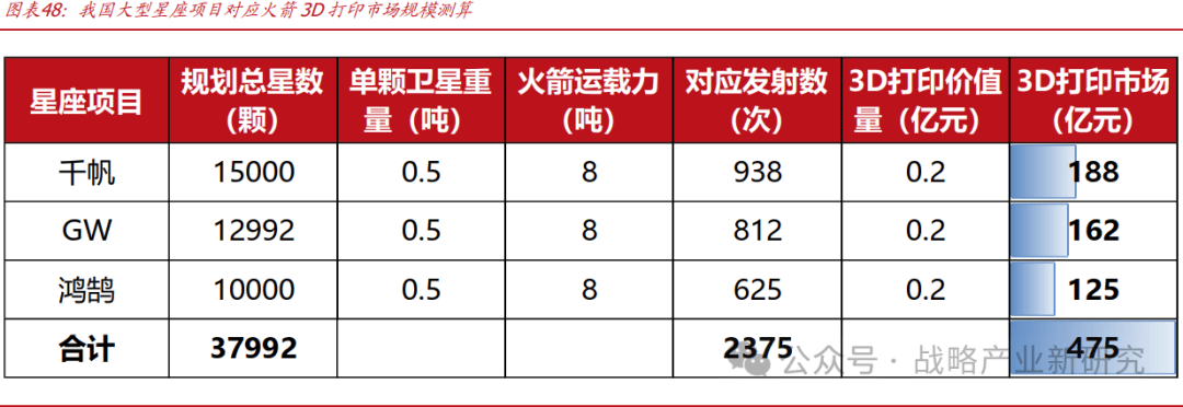 航天 3D 打印市场规模测算◆●◁,3 大星座项目对应 2000 余次发射•,带来 475 亿元 3D 打印累积市场规模。我们对 3D 航天打印市场规模进行测算•:目前我国有 3 个大型星座项目,分别为千帆、GW、鸿鹄○○,规划卫星数量分别为 1.5••、1.3==、1 万颗◆,假设单颗卫星重量 0▷.5 吨,单枚火箭运载能力 8 吨,则需要 2375 次发射才能满足 3 大星座项目对应的总卫星并轨需求。假设单枚火箭发动机 3D 打印价值量为 2000 万元,在不考虑发动机重复使用的情况下★●,则我国航天 3D 打印市场规模有望累积达 475 亿元。