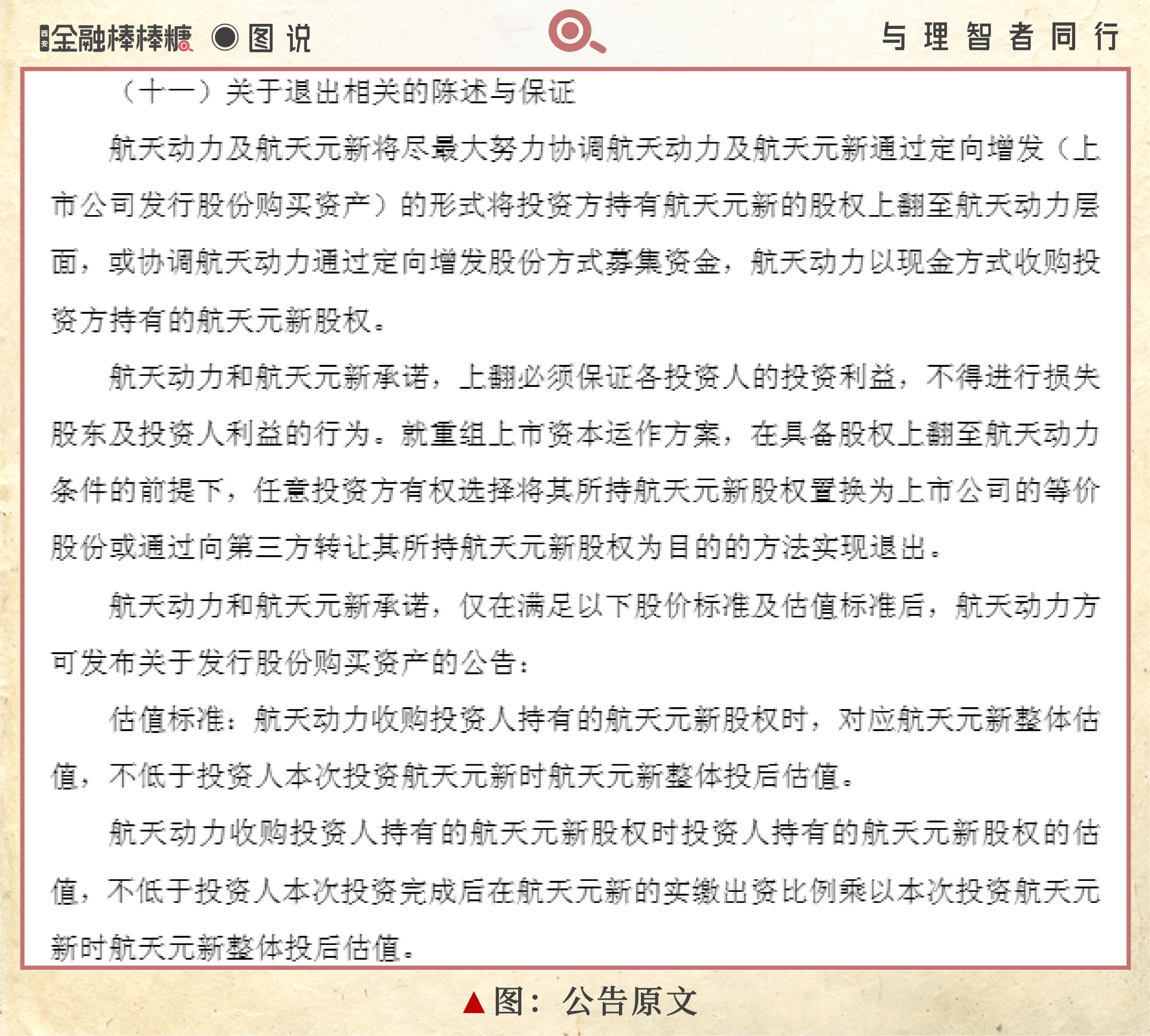 据公告信息,航天动力及航天元新将尽最大努力协调通过定增将基金持有航天元新的股权上翻至上市公司层面,或协调上市公司通过定向增发股份募集资金=★,航天动力以现金方式收购基金持有的航天元新股权,且明确不低于此次增资的投后估值。