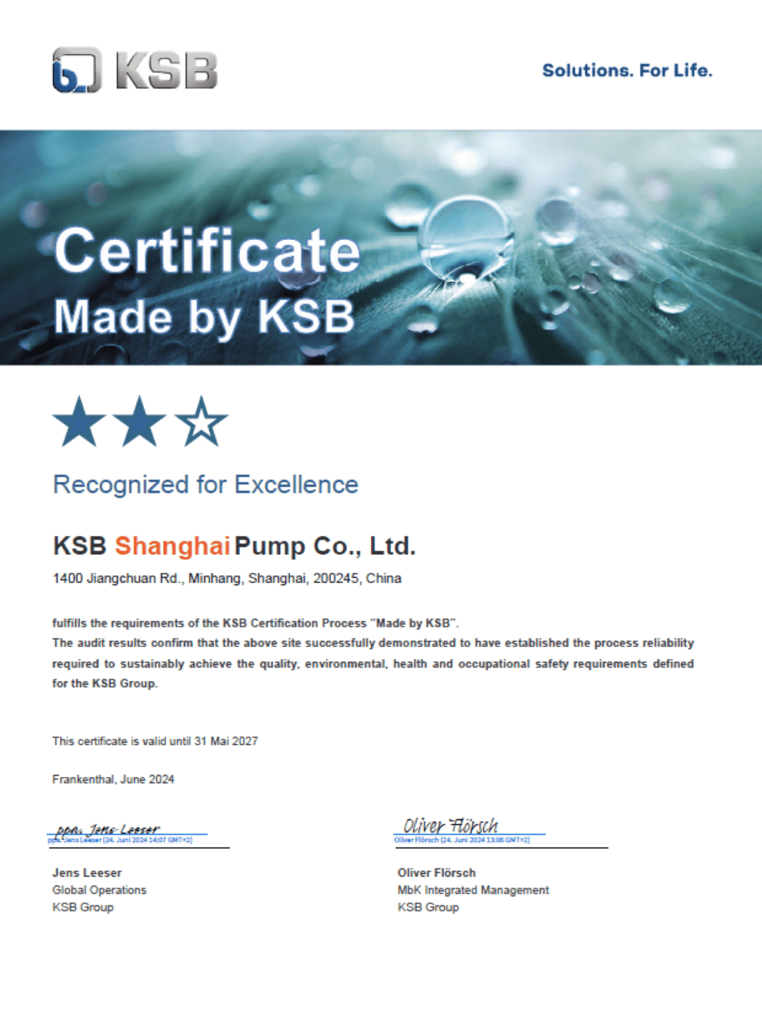 MBK二星认证的获得,是上海凯士比泵制造能力获得全球认可的标志性事件△▼。“在凯士比全球几十家工厂中,能够获得这一认证的寥寥无几,而上海工厂在首次申请中就获得两星评级,更是难能可贵●…。”