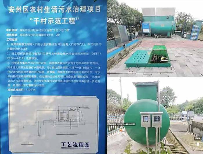 (黄土镇柴玉村8组(右上)、花荄镇联丰村(5组/6组),千村MBR一体化系统污水处理站项目场景之一,及安州区河清镇卧龙村1、2组“千村示范工程”一体化污水处理工艺流程告示牌)