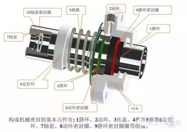 它的主要功用将易泄漏的轴向密封改变为较难泄漏的端面密封。它广泛应用于泵、釜、压缩机及其类似设备的旋转轴的密封。机械密封通常由动环、静环、压紧元件和密封元件组成。其中动环随泵轴一起旋转,动环和静环紧密贴合组成密封面,以防止介质泄漏。