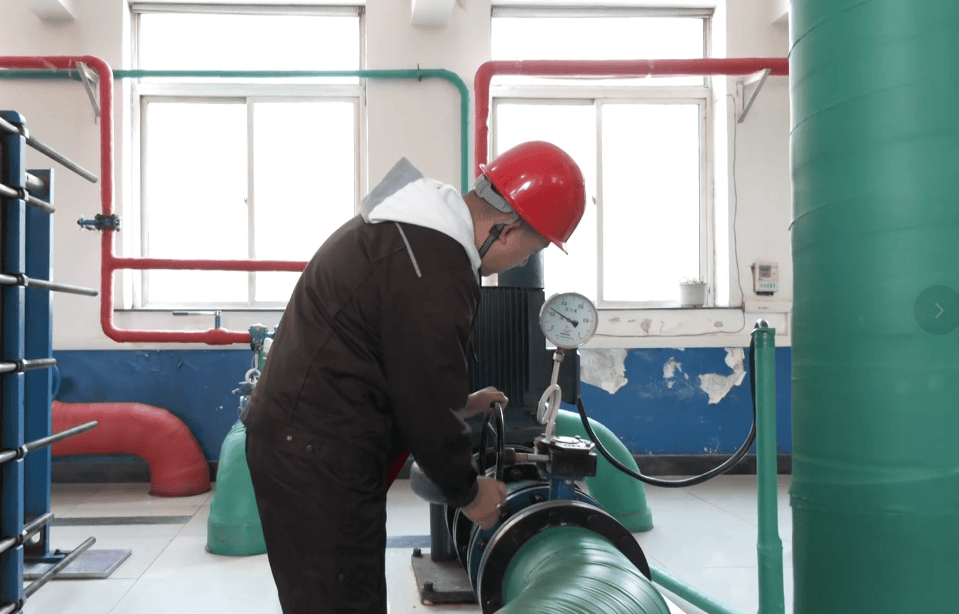 在白山华生热力有限公司江北供热所泵站记者看到,工作人员正在检查泵站内的分水器、板式换热器、集水器等设备,保证辖区内供热平稳运行。